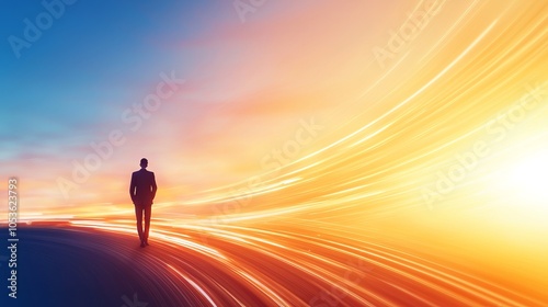 Silhouette of a person walking towards a vibrant horizon, symbolizing hope, journey, and personal growth.