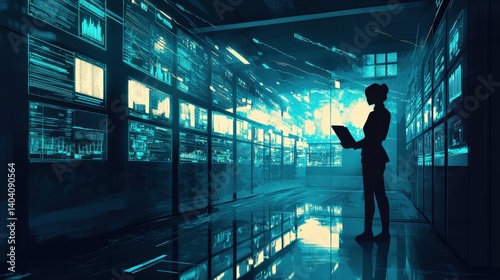 Silhouette of a professional woman using a laptop in a high-tech data center with glowing screens