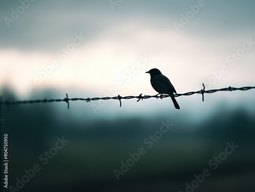 Silhouette of a Small Bird Perched on Barbed Wire Against a Softly Lit, Overcast Sky at Dusk