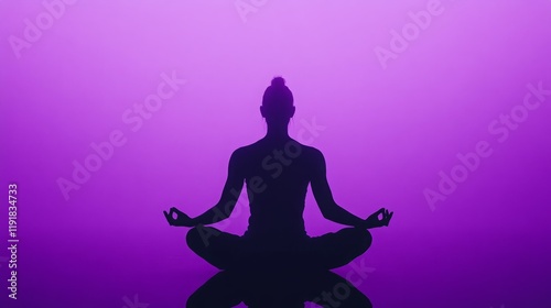 Silhouette of a woman meditating in a purple studio. Serene and peaceful yoga pose.