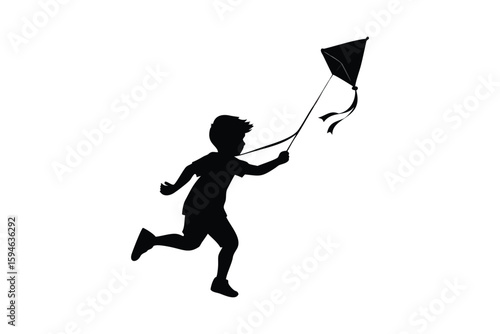 Silhouette of a young boy running and flying a kite on a white background perfect for illustrating childhood memories and carefree joy silhouette