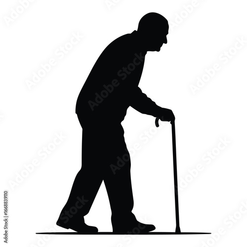 Silhouette of an elderly man walking with a cane representing aging and mobility challenges silhouette