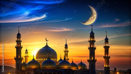 silhouette of an iconic mosque stands with a crescent moon of deep blues and golden hues, mosque at sunset