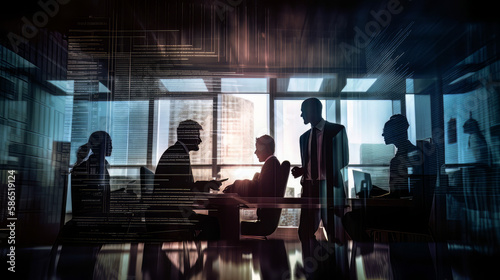 Silhouette of business people work together in office. Concept of teamwork and partnership. double exposure with light effects