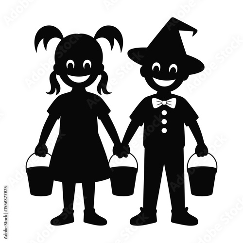 Silhouette of children smiling with candy buckets in Halloween costumes on isolated black and white background