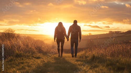 Silhouette of couple holding hands while walking towards a stunning sunset.