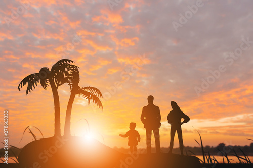 Silhouette of Father mother and daughter playing on stone at beach evening sunset background, Happy family concept