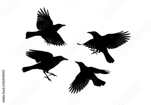 Silhouette of four crows flying, isolated on white background