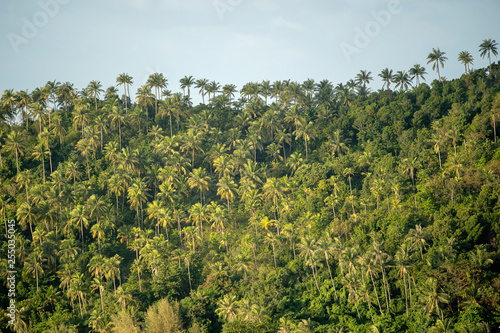 Silhouette of green coconut trees background on the mountain at island Koh Phangan, Thailand