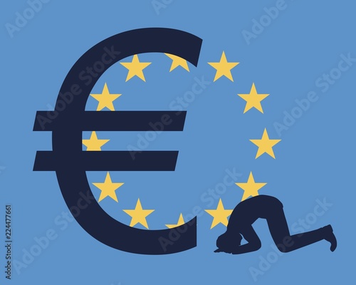 Silhouette of man in prayer pose. Man and symbol of euro currency. Flag of the European Union on backdrop
