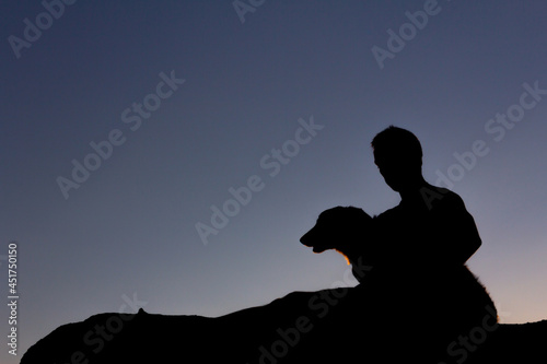 Silhouette of man playing with his dog at sunset. Backlight. Copy space.