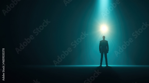 Silhouette of man stands in dark space illuminated by single beam of light, creating dramatic and mysterious atmosphere. contrast between light and shadow evokes sense of intrigue and anticipation
