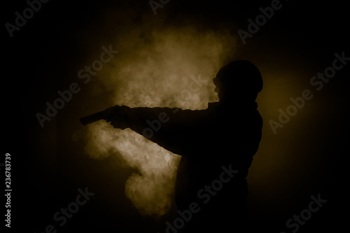 Silhouette of man with assault rifle ready to attack on dark toned foggy background or dangerous bandit in black wearing balaclava and holding gun in hand. Shooting terrorist with weapon theme decor