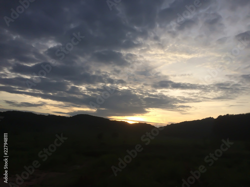 Silhouette of mountain under evening sky with dark clouds and sunsets.