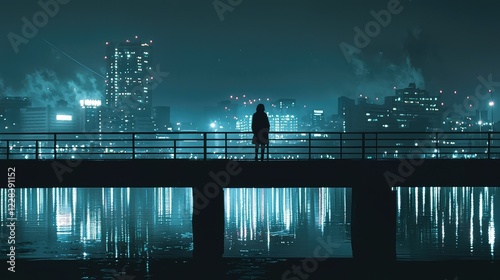 Silhouette of Person on Bridge Against Urban Nightscape Reflections