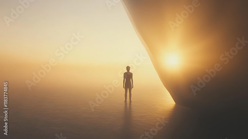 Silhouette of person standing near abstract structure with glowing sunset and calm waters