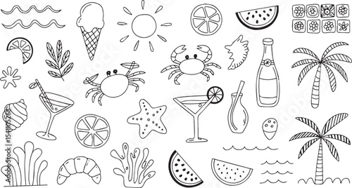 Silhouette of Summer Beach Doodles Vector Set with Fruits, Drinks, Crabs, and Palms