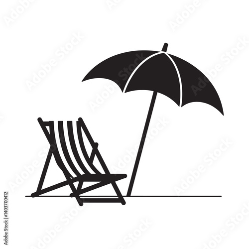 Silhouette of Tropical Beach scene with umbrella and chair on white background, perfect for summer relaxation