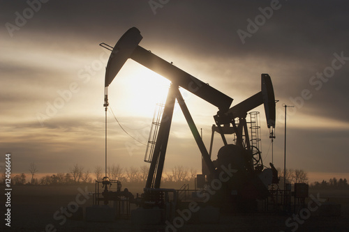 Silhouette of two pump jacks at sunrise with clouds, Alberta, Canada