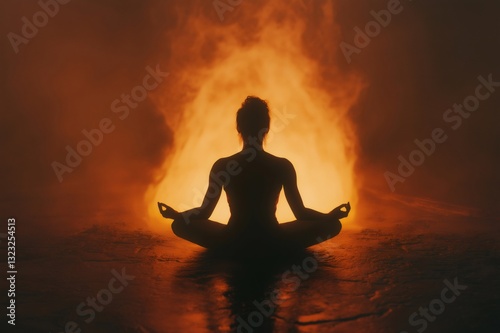 Silhouette of woman practicing yoga in lotus position with orange smoke in background, perfect for mindfulness and meditation concepts