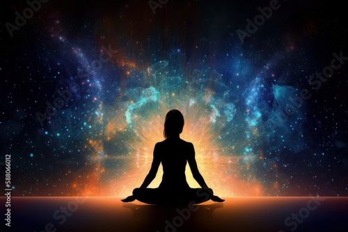Silhouette of yoga woman in lotus pose against a galaxy background, Generative Ai