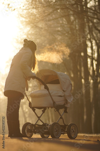 Silhouette of young woman on sunny footpath and looking at child in baby stroller. Winter park, childcare and love