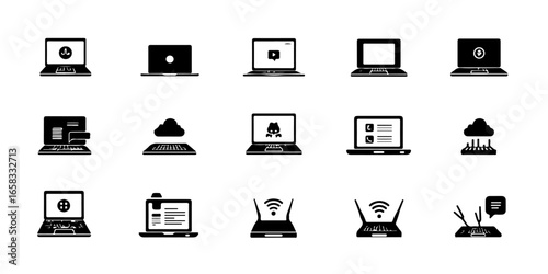 Silhouette Set of Remote work culture icons including laptops, video calls, cloud folders, task boards, and Wi-Fi routers