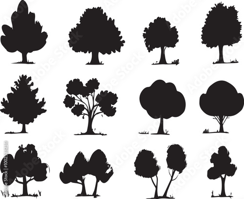 Silhouette tree set. Side view, set of graphic trees elements outline symbol for architecture and landscape design drawing. Hand drawn vector illustration