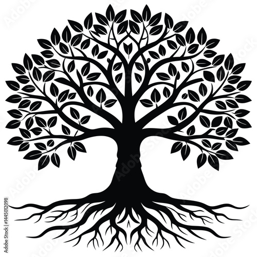 Silhouette Tree with Leaves and Roots Nature, Growth, Black, Isolated, Round Shape