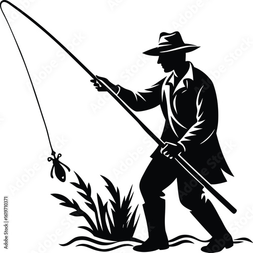 Silhouette vector illustration of a person with a fishing rod, contour, hobbyist, pose, quiet, shore, wild