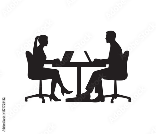 "Silhouette Vector of a Man and Woman Sitting on Chairs with a Laptop Between Them, Engaged in a Professional Office Meeting and Collaboration."