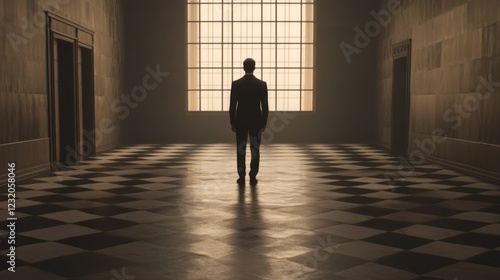 Silhouetted businessman standing in a large, dimly lit hallway with a large window at the end.