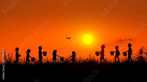 Silhouetted children carrying baskets at sunset, creating a serene, joyful scene.