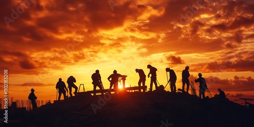 Silhouetted Construction Workers Toiling Under a Dramatic Sunset Sky
