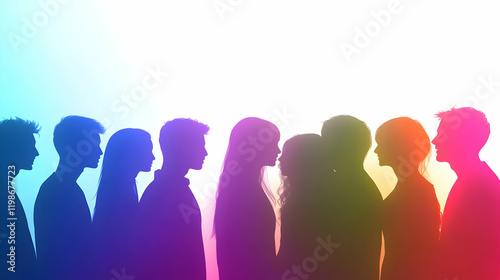 Silhouetted Couples and Individuals Stand Close Together in a Rainbow Gradient Background