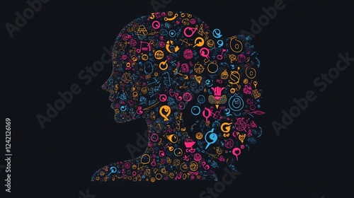 Silhouetted female profile adorned with vibrant icons symbolizing brainstorming and creative thinking