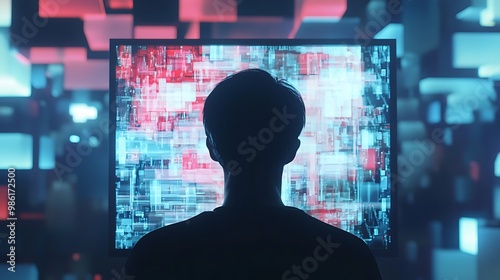 Silhouetted Figure Facing a Screen Displaying Abstract Blue and Red Blocks