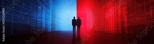 Silhouetted figures against a vibrant blue and red backdrop, representing contrasting ideas and choices.