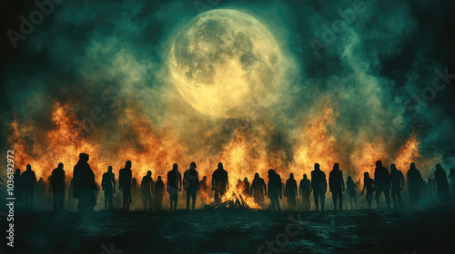 Silhouetted figures gather around a large fire, illuminated by a glowing full moon as smoke and flames fill the dark night air