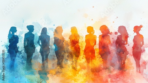 Silhouetted Figures in a Colorful Watercolor Background Representing Diversity, Femininity, and Unity in a Creative and Artistic Manner