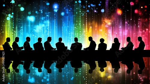 Silhouetted figures of diverse professionals engaged in discussion against a vibrant, colorful backdrop, creating a dynamic and energetic atmosphere.