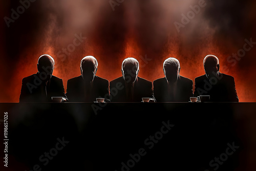 Silhouetted Figures Sit at Table with Cups in Dramatic, Red-Hued Setting.