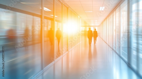 Silhouetted figures walking modern office corridor, sunlit, blurred background, business concept