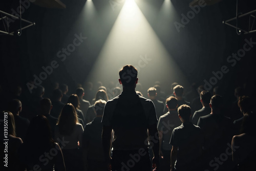 Silhouetted man standing alone facing a bright light surrounded by a crowd