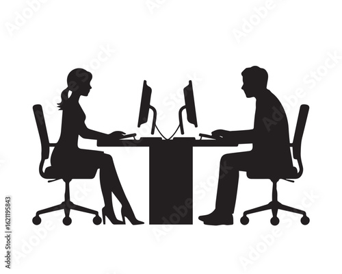 Silhouettes of a man and woman working on computers at a desk black silhouette vector, Simple silhouette Design vector icon with white background