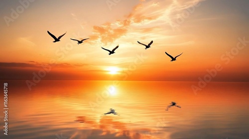 Silhouettes of birds in flight at sunset over a calm reflecting ocean.