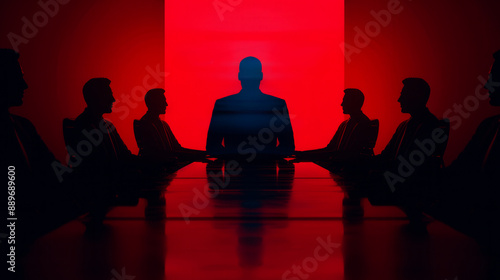 Silhouettes of business people in a meeting room with red lighting, creating a dramatic and intense atmosphere.