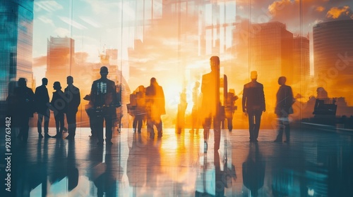 Silhouettes of Business People Reflected in a Glass Wall with a Cityscape Background at Sunset