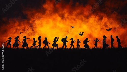 Silhouettes of children and adults dancing against a dramatic fiery background, evoking a sense of joy amidst chaos.