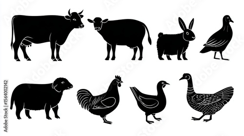 Silhouettes of Farm Animals Including Cow Sheep Chicken Duck Rabbit and Pigeon on White Background